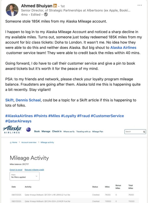 In August 2025, the author saw a LinkedIn post about an Alaska Airlines member having his account drained of loyalty points and subsequently replenished. Others responded to report the same experience.