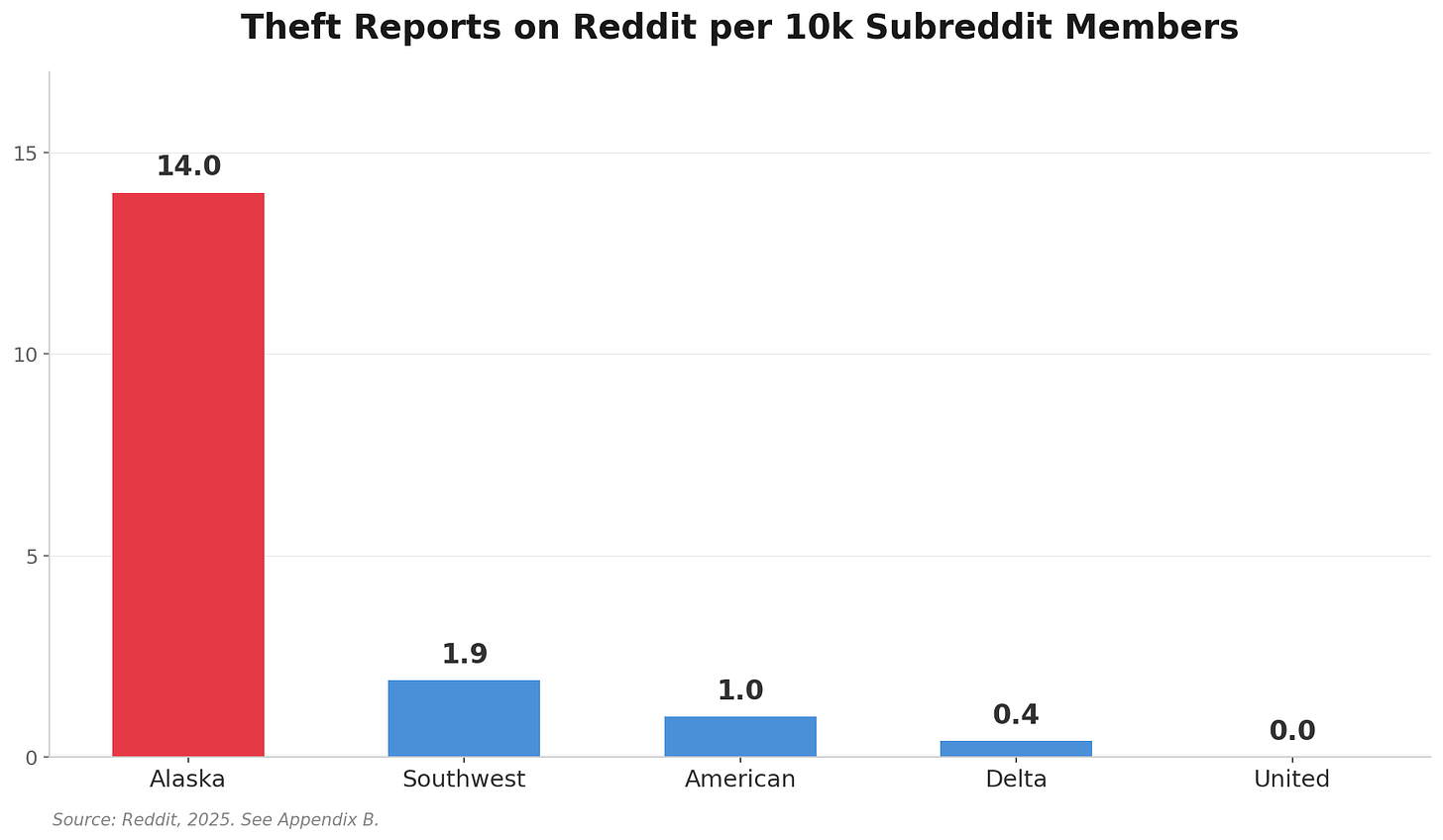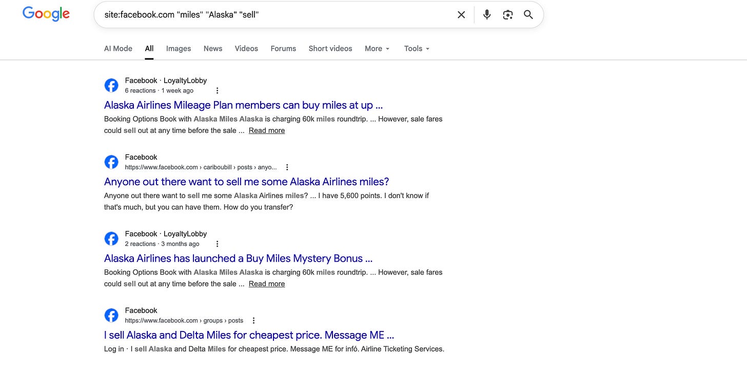 A snapshot was taken with controlled search terms to confirm what a cursory internet search shows indisputably: Alaska is suffering from loyalty account theft at a rate unmatched by any peer airline.
