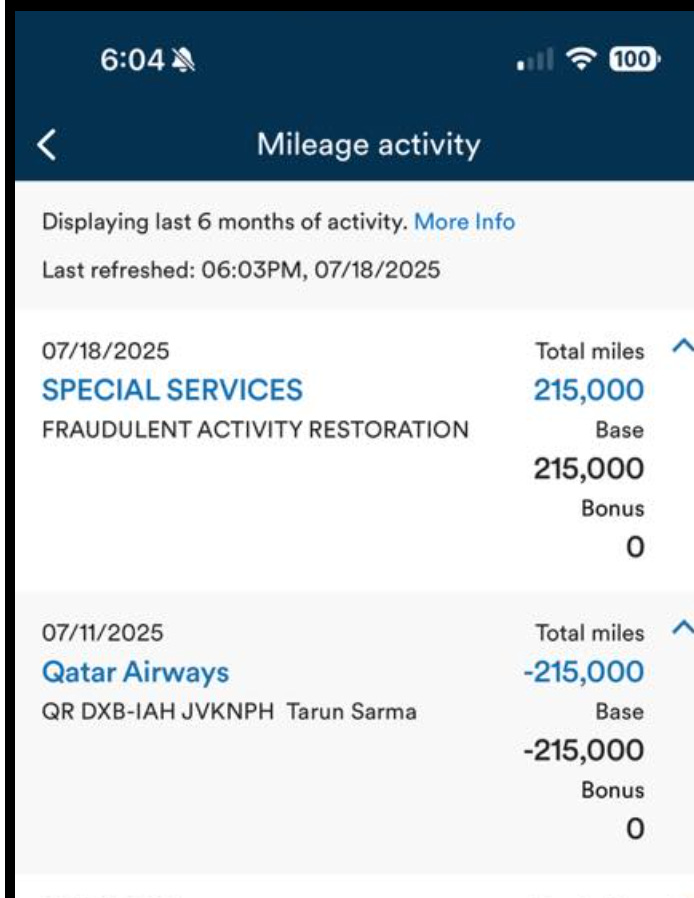 On 12 July 2025, an Alaska Airlines loyalty member discovered that their account had been compromised and their miles used to book a business class flight for an unknown individual travelling from Dubai to Houston via Qatar Airways. (link) (archive link)