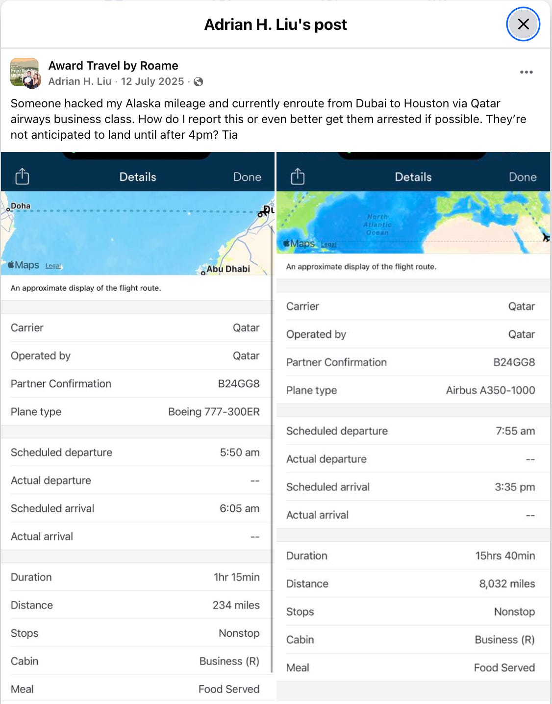 Victim’s statement: “Someone hacked my Alaska mileage and currently enroute from Dubai to Houston via Qatar airways business class. How do I report this or even better get them arrested if possible. They’re not anticipated to land until after 4pm.”