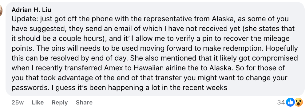 The victim’s update shows: Alaska Airlines customer service mentioning the compromise may be linked to a recent data transfer issue, suggesting awareness of a broader security problem;
