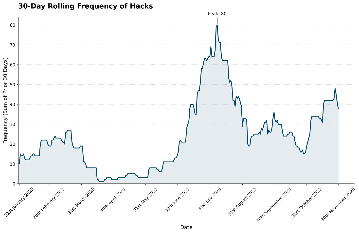I drew a line at the end of November and found 265 separate hacks, averaging 218,000 miles per hack. You can see the peaks and troughs of reporting in this chart: