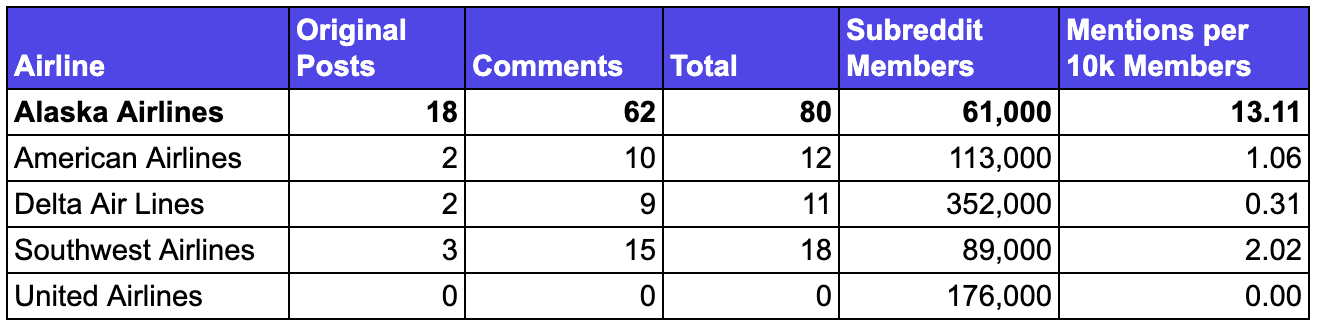 I isolated my search to Reddit as it was the most frequently cited channel. Also because it’s open to Boolean search within each airline’s subreddit. I looked for posts with “hacked” or “stolen” in the title and text. After eliminating those relating to stolen suitcases and travel hacks, I read the comments to see who else announced their account being compromised. I time-boxed the analysis for this year up to the end of November.