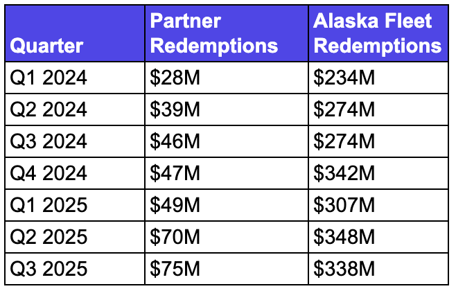 There is another data point that caught my attention. Alaska reports “Loyalty Redemptions - Partner Airlines” as a separate line item - this represents the value of miles redeemed on airlines like Qatar Airways, Emirates, British Airways, and so forth.
