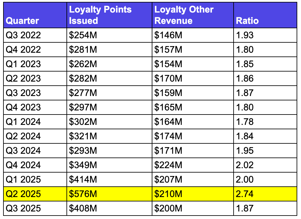 Yet “Loyalty Other Revenue” - the immediate profit Alaska recognises from mile sales - barely moved. It was $210 million in Q2 2025, $3M higher than Q1 2025, despite the massive spike in issuance.